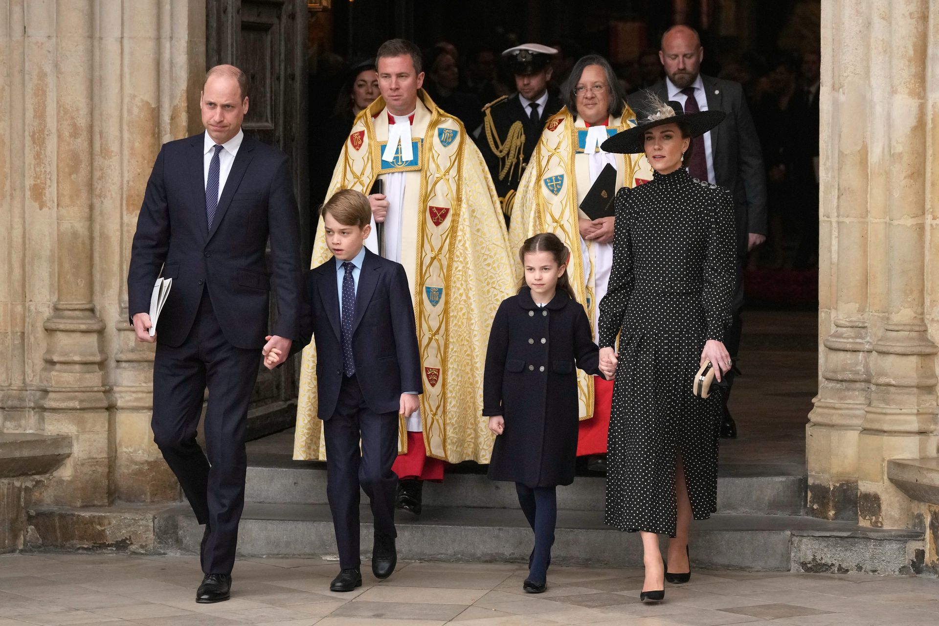 英國威廉王子(Prince William)和凱特王妃(Kate, The Duchess of Cambridge)帶著他們的孩子喬治王子(Prince George)和夏洛特公主( Princess Charlotte)抵達倫敦威斯敏斯特教堂(西敏寺)參加菲利普親王追思會。