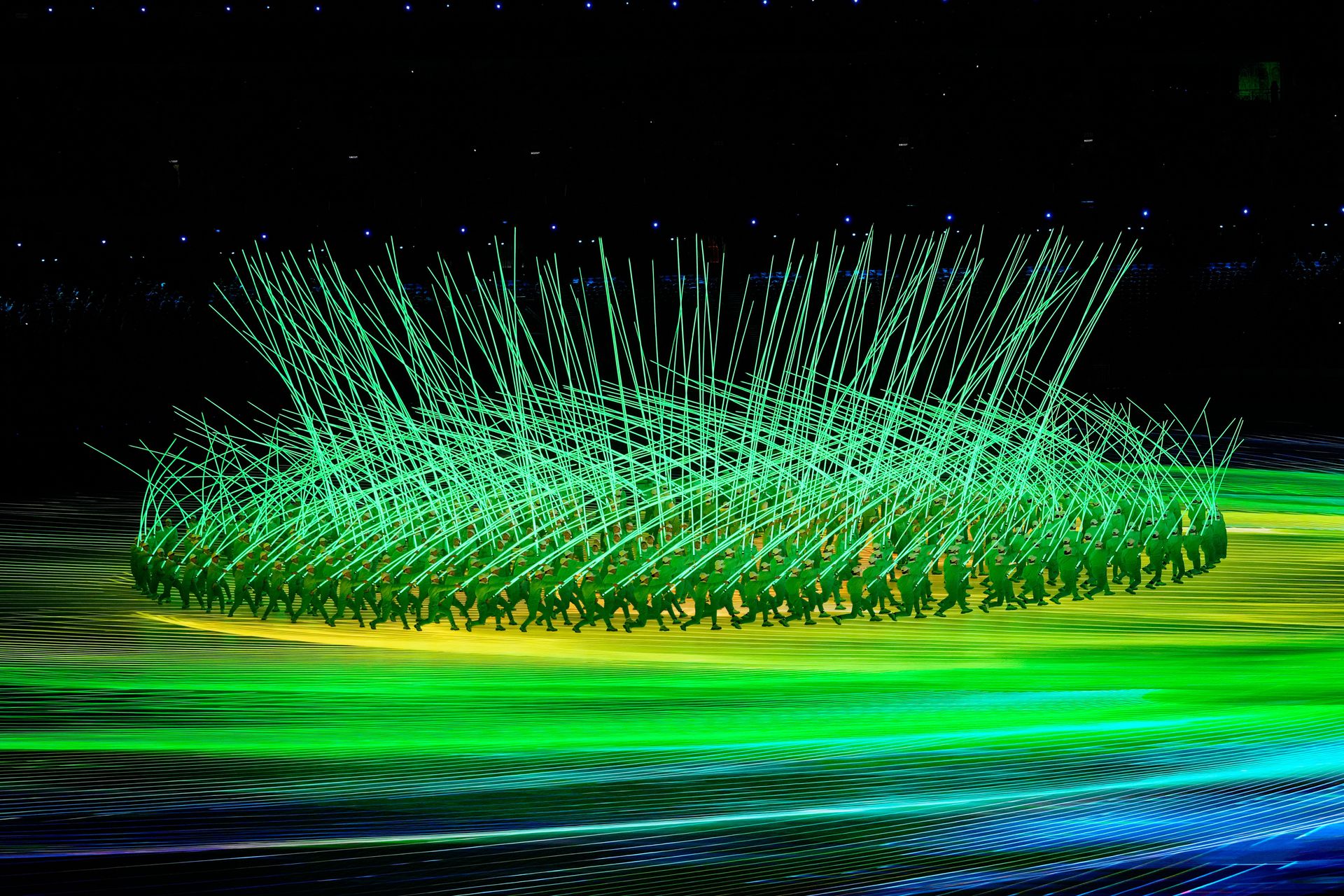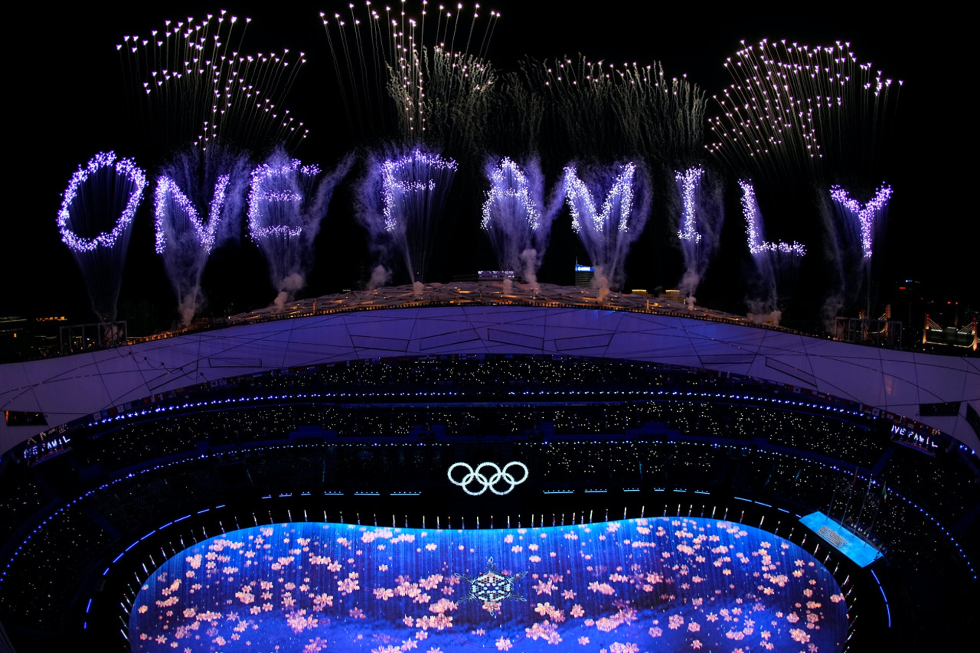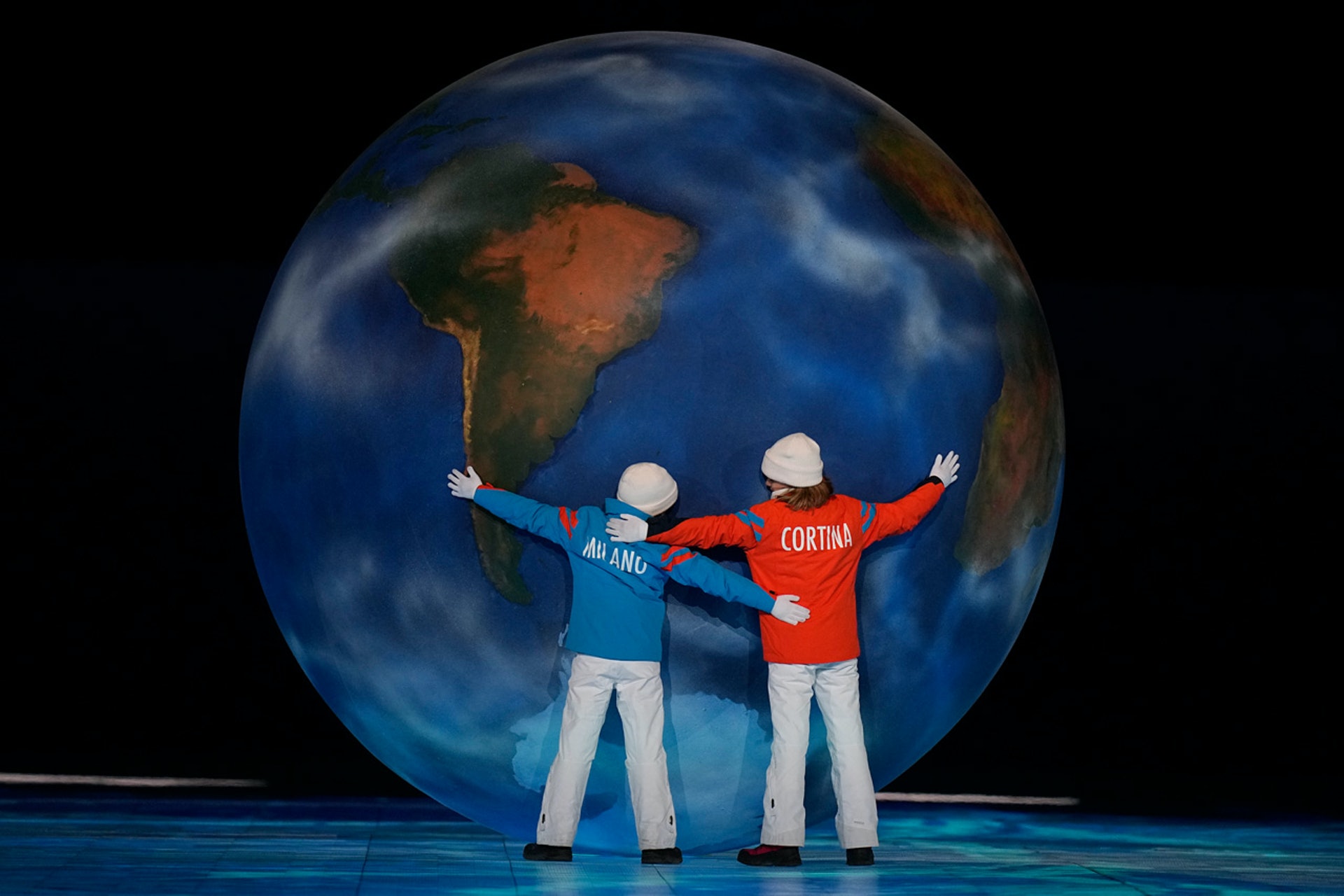 北京冬奧閉幕禮以煙花作結,在天空造出「天下一家」、「ONE WORLD, ONE FAMILY」的字眼。代表下屆冬奧 米蘭-科爾蒂納丹佩佐(Milano Cortina 2026)的表演者 在舞台上表演。